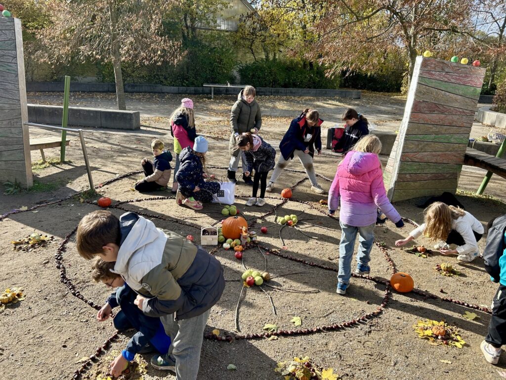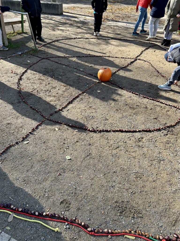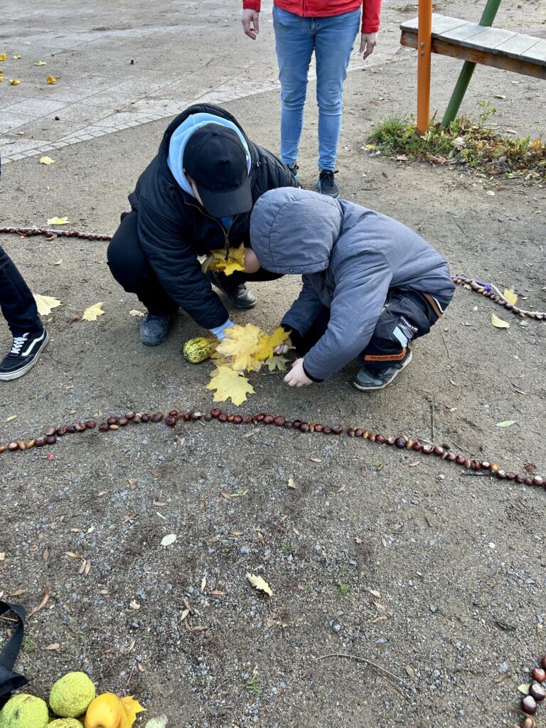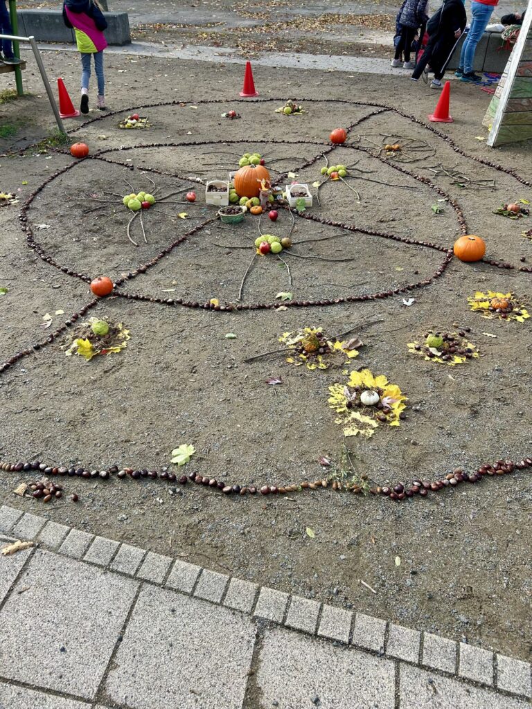 Zum Abschluss haben wir – passend zum Erntedankfest – im Schulhof ein großes Herbstmandala aus Naturmaterialien gelegt.