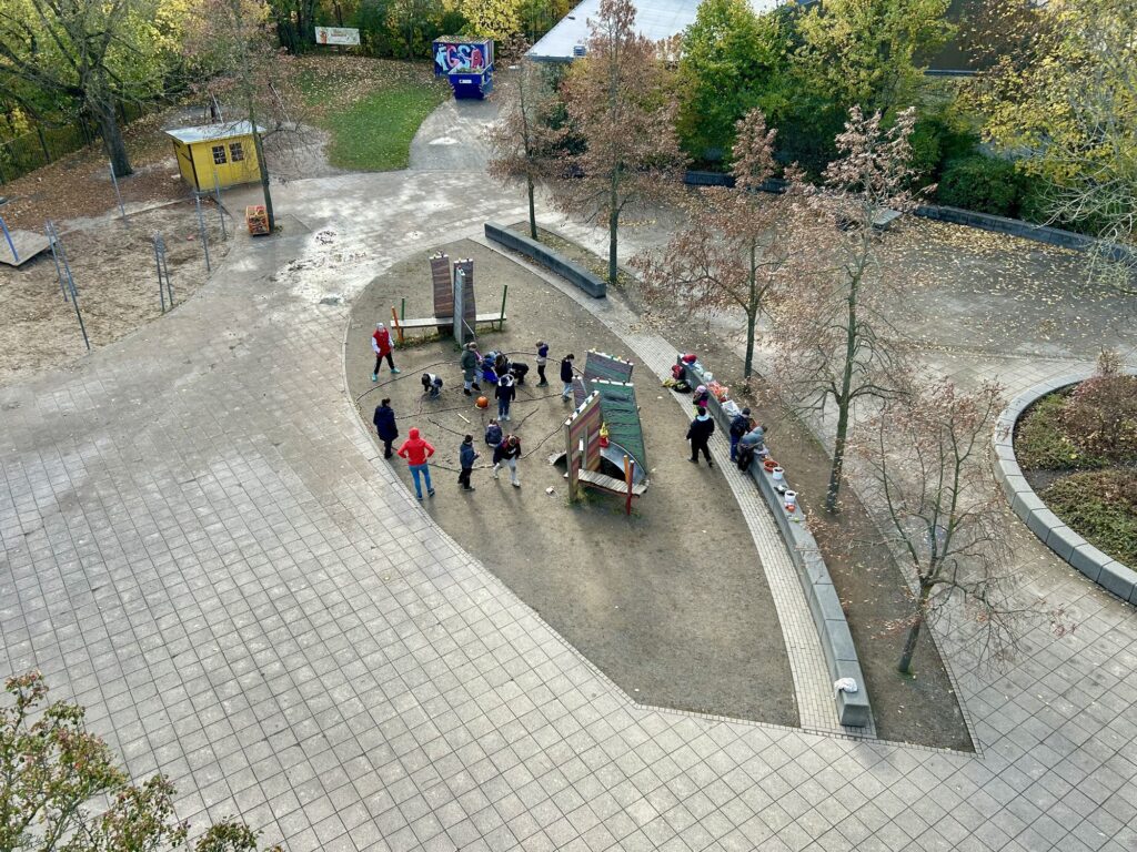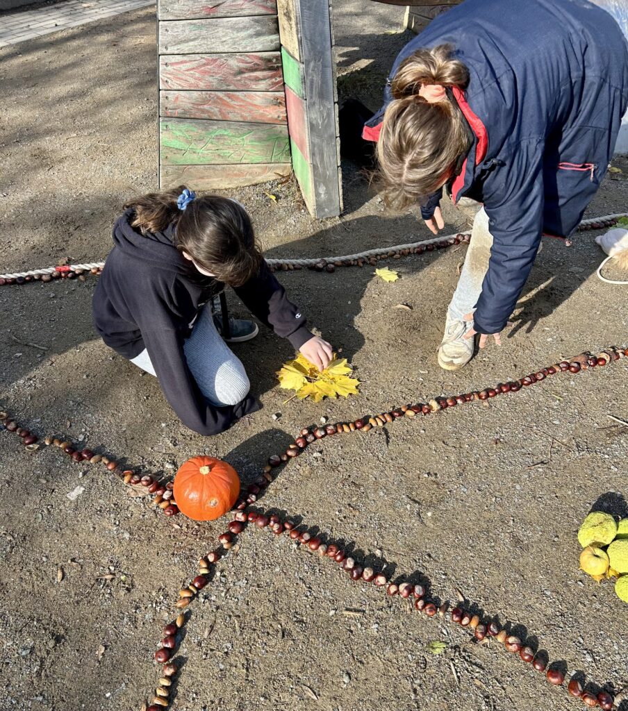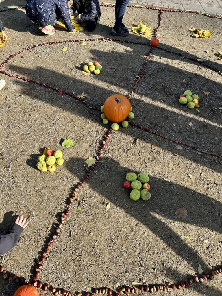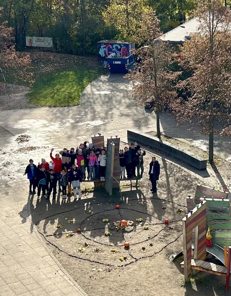 Zum Abschluss haben wir – passend zum Erntedankfest – im Schulhof ein großes Herbstmandala aus Naturmaterialien gelegt.